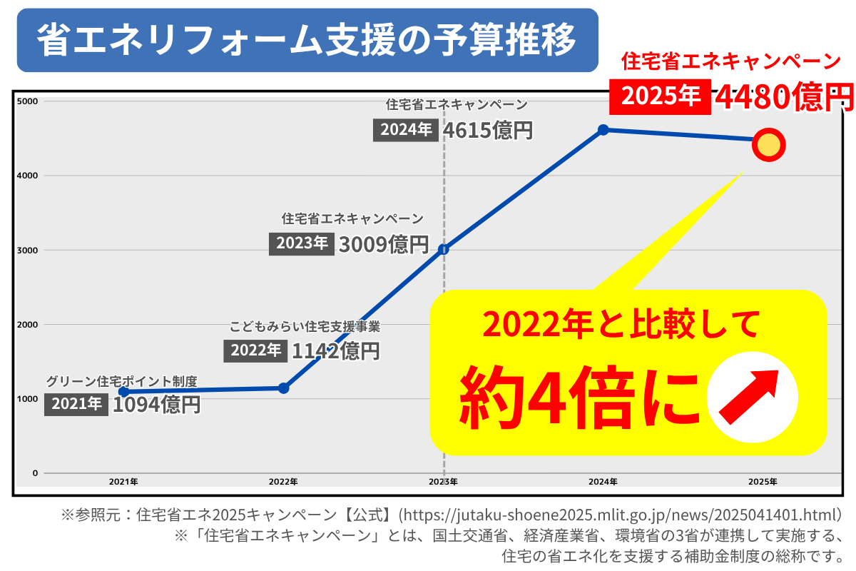 国が省エネを推進する支援制度も、2022年と比べても約4倍の予算規模に伸びています!
