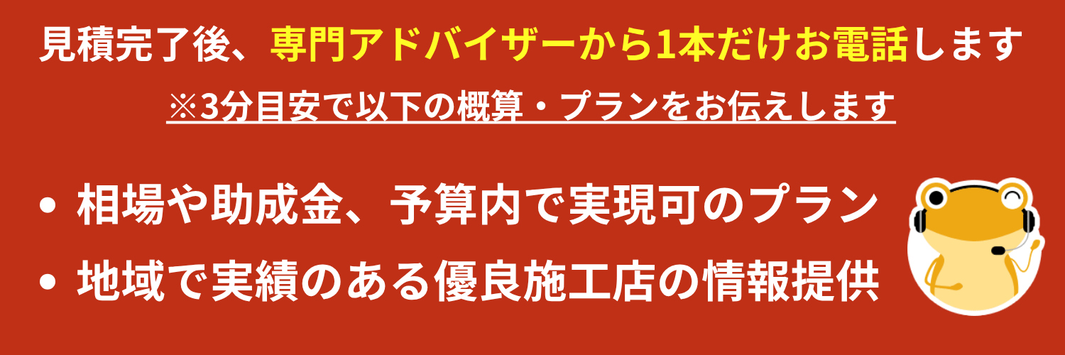 住所や間取り等の情報を入力するだけで、工事費用の相場、助成金の確認や手続き方法、一番安い施工店まで全部無料で教えてくれます!